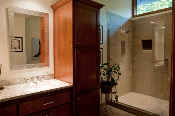 With the help of our Star Builders design staff, our clients chose a light-colored Granite top with a mix of earth tones, designer glass mosaic tile backsplash and beautiful rich cherry cabinets fitted with stainless hardware. We also created a custom tiled shower with a bench, (2) niche’s, large format wall tile that included a border strip from floor to ceiling, clear estate glass frameless shower door and large format porcelain tile floors. By changing the overall layout, we were able to maximize the underutilized available space and create a true “Master bathroom” that encompassed all our client’s goals and needs.