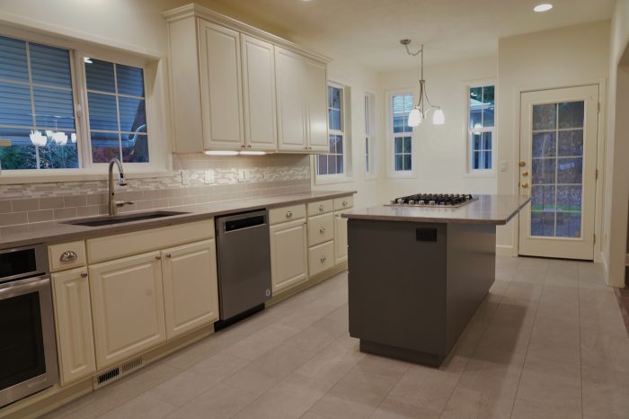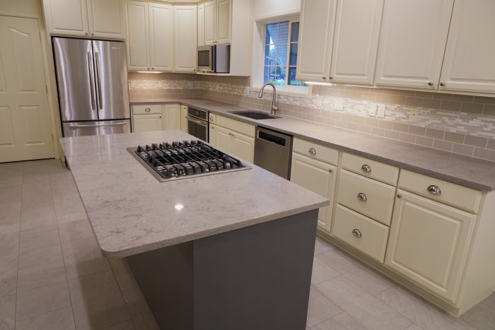 Our clients chose grey white granite countertops, classic subway tile backsplash and white painted raised panel style cabinets and island with stainless steel pull hardware. Stainless steel oven, microwave, dishwasher, and Refrigerator top this off. All new Luxury Vinyl Plank flooring throughout the Dining room transitions easily to the 12 x 24 porcelain tile Kitchen flooring and finish off the design.